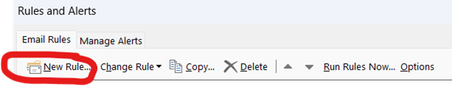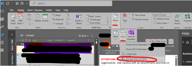 1. On the ribbon, select the File tab then in the Move section, select Rules > Manage Rules & Alerts.