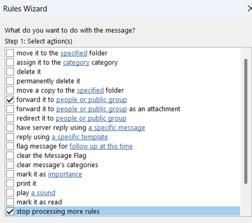 5. Under Step 1: Select action(s), select redirect it to people or public group and stop processing more rules.