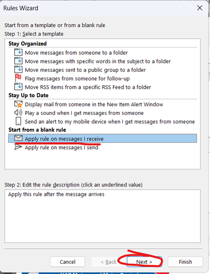 3. Under Start from a blank rule, select Apply rule on messages I receive. Select Next.